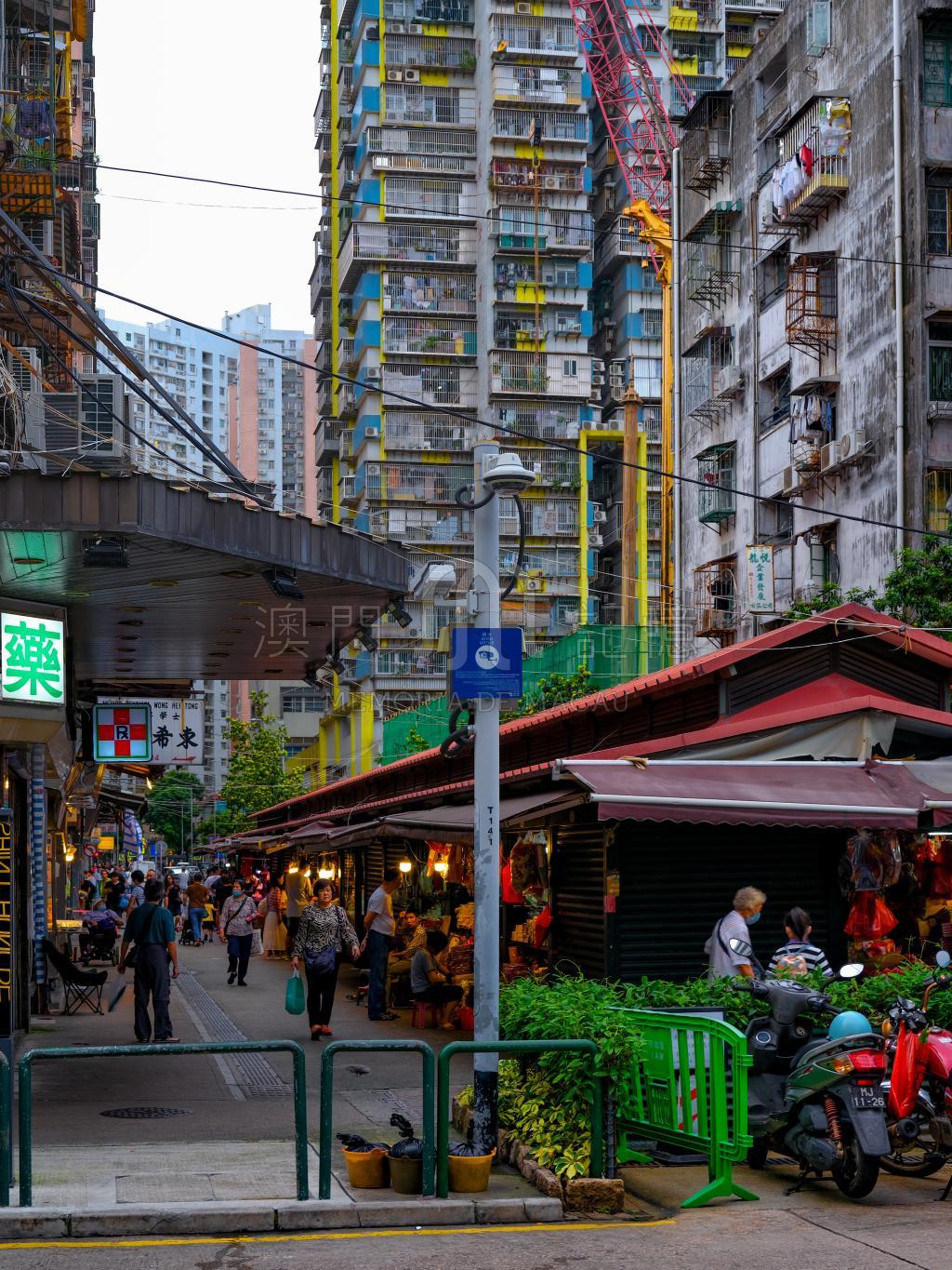 圖片呈現擁擠的街道場景,包含彩色老舊住宅樓、傳統市場攤位及行人活動。建築外牆的斑駁、晾衣架和電線交錯,與市場的鮮活氛圍形成對比。施工吊機暗示城市變遷,摩托車和路邊植物增添生活氣息。