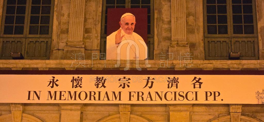 為悼念已故的教宗方濟各,天主教澳門教區舉行悼念活動。其中主教座堂門前懸掛大幅白底紅字橫額,並寫上「永懷教宗方濟各」字樣,橫額上掛着教宗的遺像。