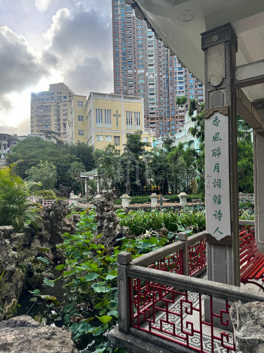 圖片攝於2024年6月23日下午,後方是現代高樓大廈,左邊是基督教學校,右邊是中式涼亭。它們之間的關係錯綜複雜。