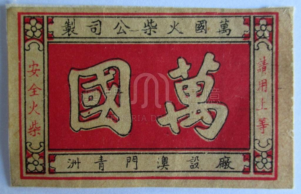 圖為萬國火柴廠的火花,其上方印有“萬國火柴公司製”,下方則有“廠設澳門青洲”,兩側有“請用上等”“安全火柴”作招徠。 萬國火柴廠於二十世紀四十年代在澳門青洲設廠。據1942年2月12日《華僑報》刊載名為〈同善堂施粟米 地點改在青洲〉的報道,由於抗戰期間,大批難民逃至澳門,為安置貧民,澳葡政府將該廠用作收容貧民,而同善堂等慈善機構亦曾在該處施賑,救濟貧民。此張火花雖小,卻從中見證澳門人民在艱苦歲月裡風雨同舟,守望相助的精神,二十世紀七十年代初該火柴廠結業。