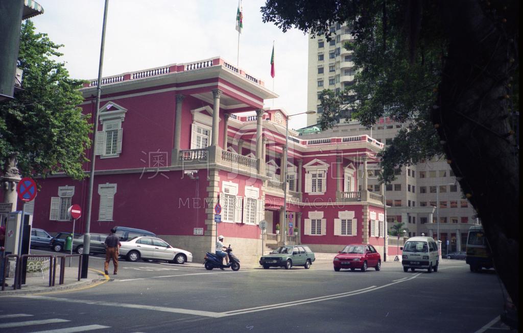 回歸前拍攝的澳督府,仍掛著葡萄牙國旗,建築物前馬路寬廣,當年澳門路上車輛不多