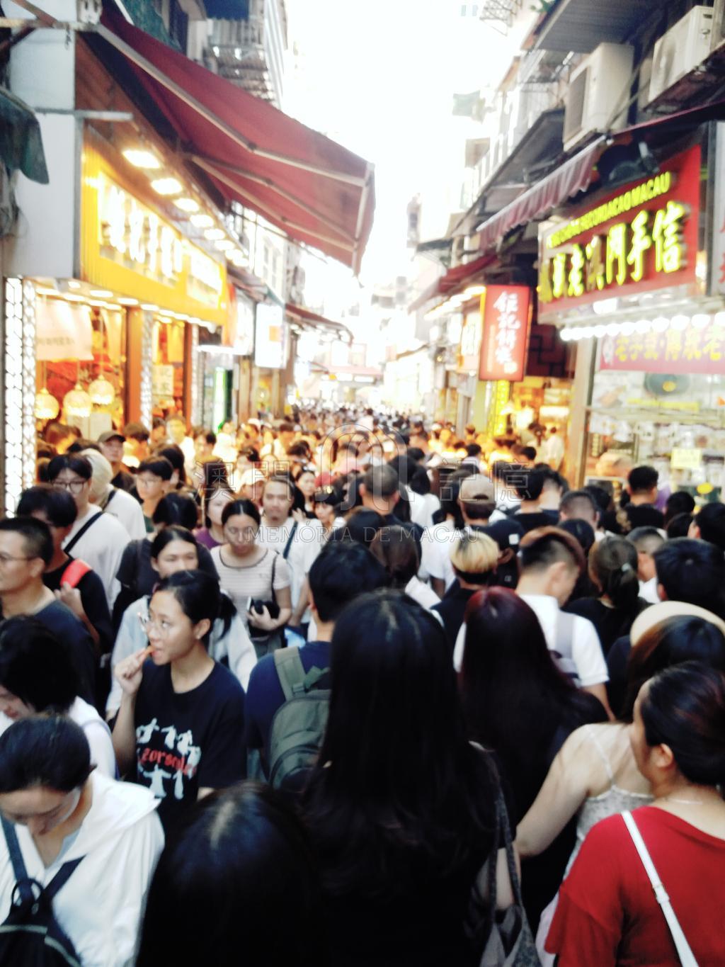 通往大三巴牌坊的街道,可能未必知道街名 ,但肯定知道名符其實的“手信街”。“手信街”一定程程度反映了遊客人潮。街道兩旁,除了餅食手信店,還屹立有“另類”的店舖:珠寶金行和衣服店。