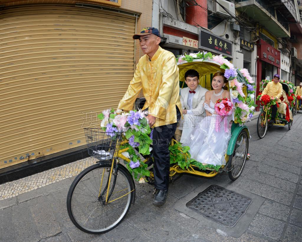 由街區社團舉辦的復古中西式婚禮活動,新郎新娘會乘坐裝飾漂亮的三輪車穿梭於舊城區(如大三巴、十月初五街)進行儀式,強調傳統文化,吸引市民和遊客,這類活動在澳門每年都會有舉辦,作為文化保育和節慶的一部分。