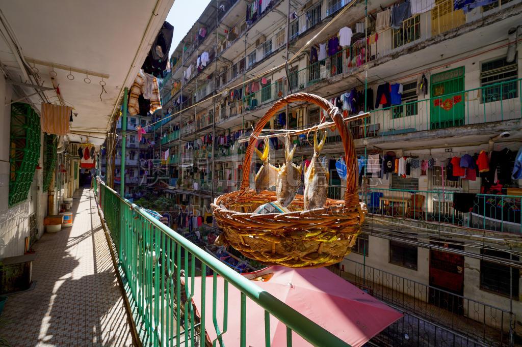 是日天氣晴朗,一戶大廈居民把腌制好的魚拿出來涼晒。