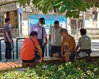 新馬路舊城區歷史悠久,周邊的街道橫街縱橫交錯,古色古香的店舖星羅棋佈,置身其間,不禁令人發思古之幽情。中、西文化交融的建築物更比比皆是,相映成趣,成為遊客駐足的熱門的景點。此外,手信業及別具風味的食肄更獨領風騷,遊客趨之若鶩。照片呈現新馬路周邊地區議事亭前地樓底術士算命的情景。