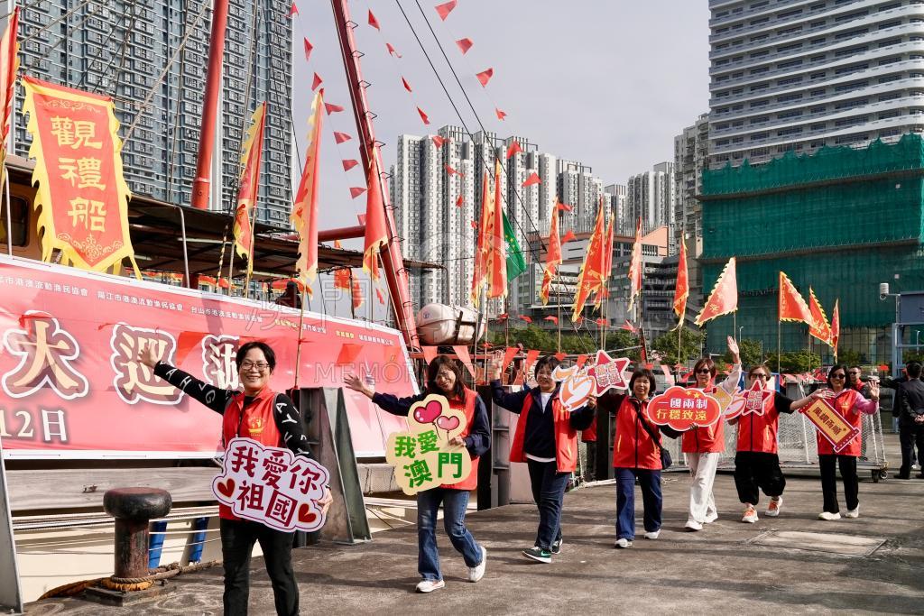 澳門漁民互助會主辦雙慶年澳門漁船大巡遊活動,市民在青洲塘開心打卡,表達賀雙慶喜悅之情。
