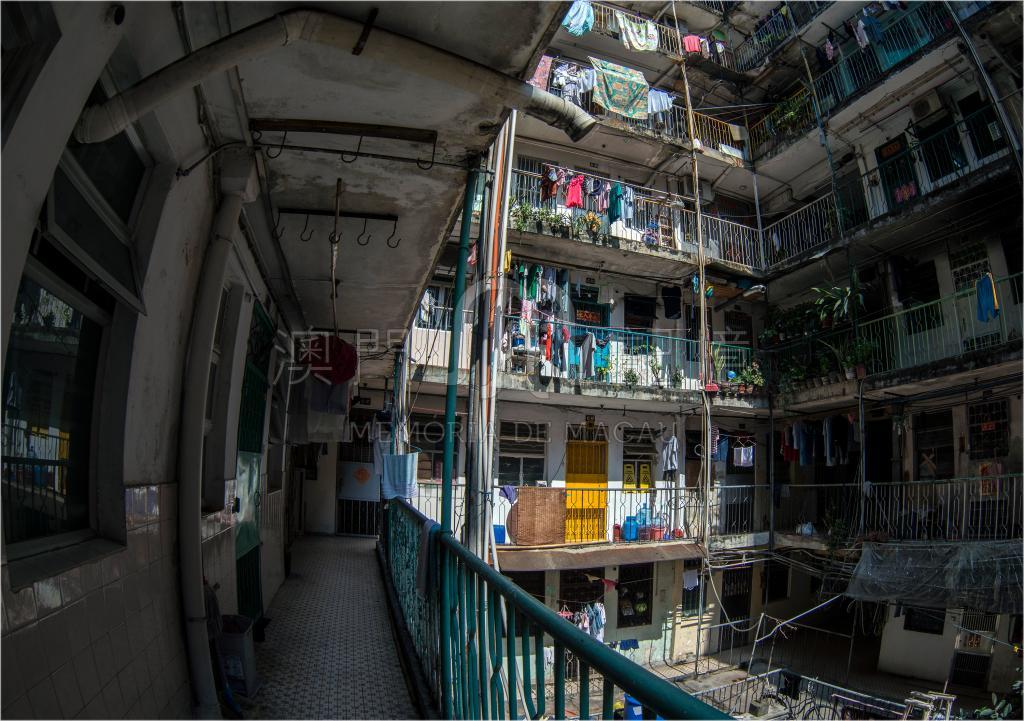 黑沙環新美安大廈第一期,大廈內中空四方的天井設計特色,迴形走廊在澳門比較少見