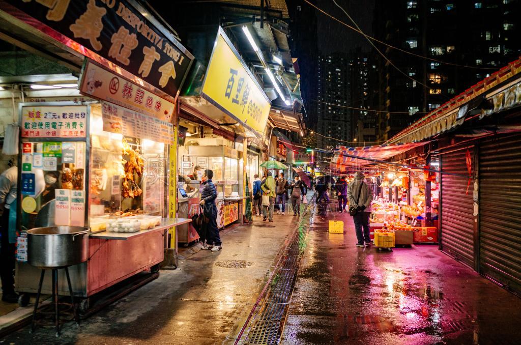 雨後街道還沾著濕意,攤檔撐著雨棚照開,小吃香、吆喝聲裡,人流依舊熱鬧。