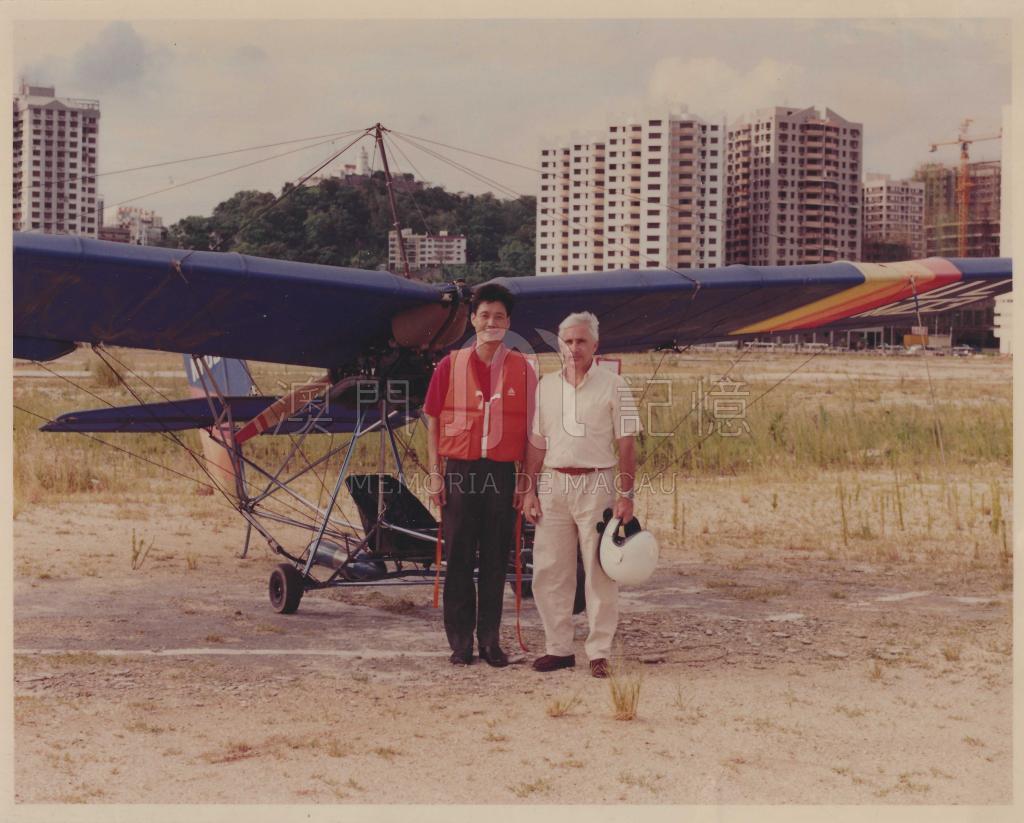 九十年代初,於葡京周邊經常看到小型飛機的蹤影,小型飛機場位於新口岸新填海的區域,圖片中背景可看到松山燈塔,圖片拍攝於現時大約金沙娛樂場的位置。
