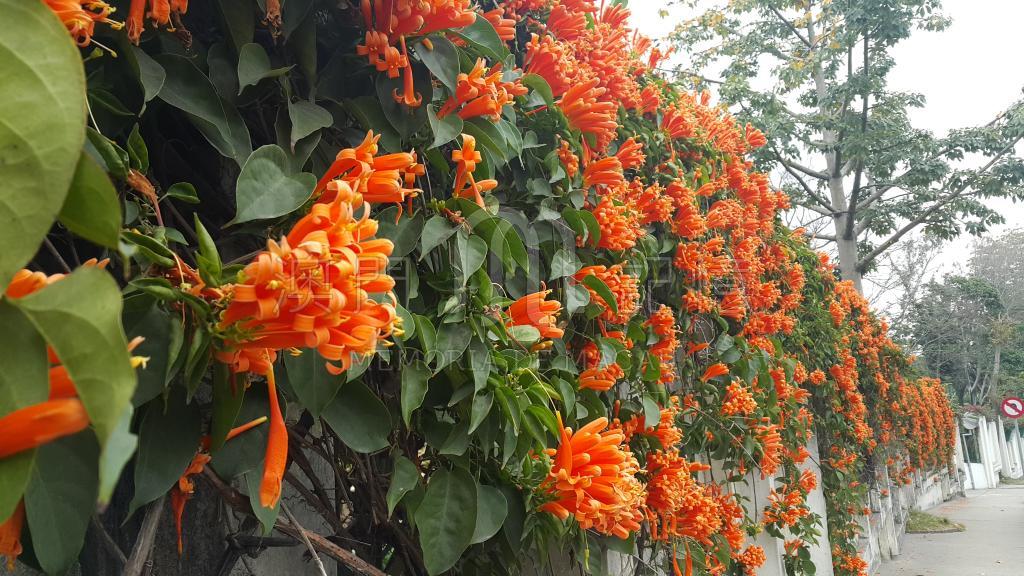 炮仗花,俗名黃金珊瑚,因其花呈金黃色且如珊瑚般成叢密集而獲此名。花期一般為二月至四月,農曆新春為盛放期,盛開時甚為壯觀,所以炮仗花亦屬於報春花的一類,只要看到盛開的炮仗花,就意味著當前季節已大地回春,欣欣向榮。