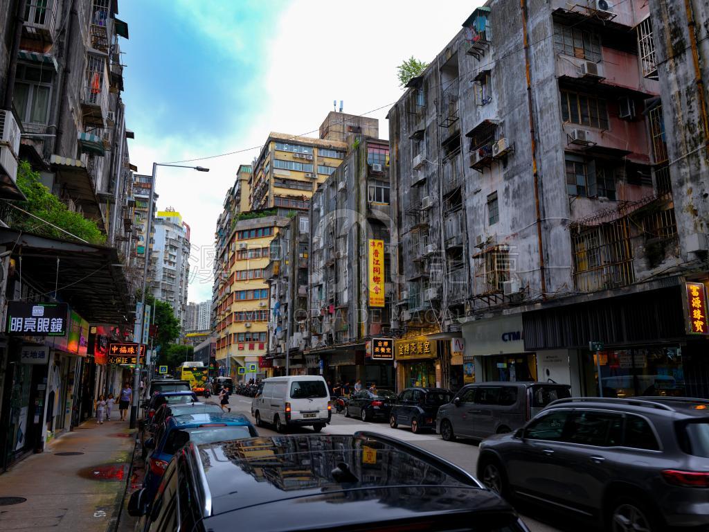 這張圖片記錄澳門祐漢新村第一街道,老舊建築與斑駁外牆展現歷史痕跡,街道上車輛與行人交織,反映社區生活熱鬧。中文招牌與高樓結合,見證澳門從傳統向現代轉型的城市風貌。