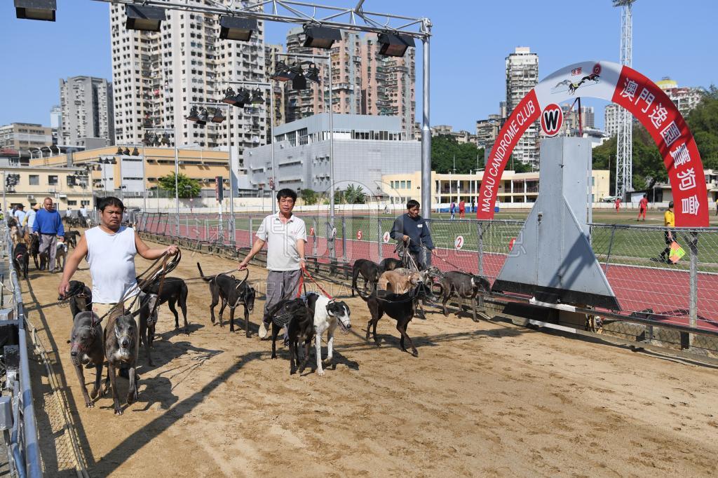 逸園工作人員帶領格力犬在賽道上散步,期望提升狗隻比賽狀態,以爭取佳績。