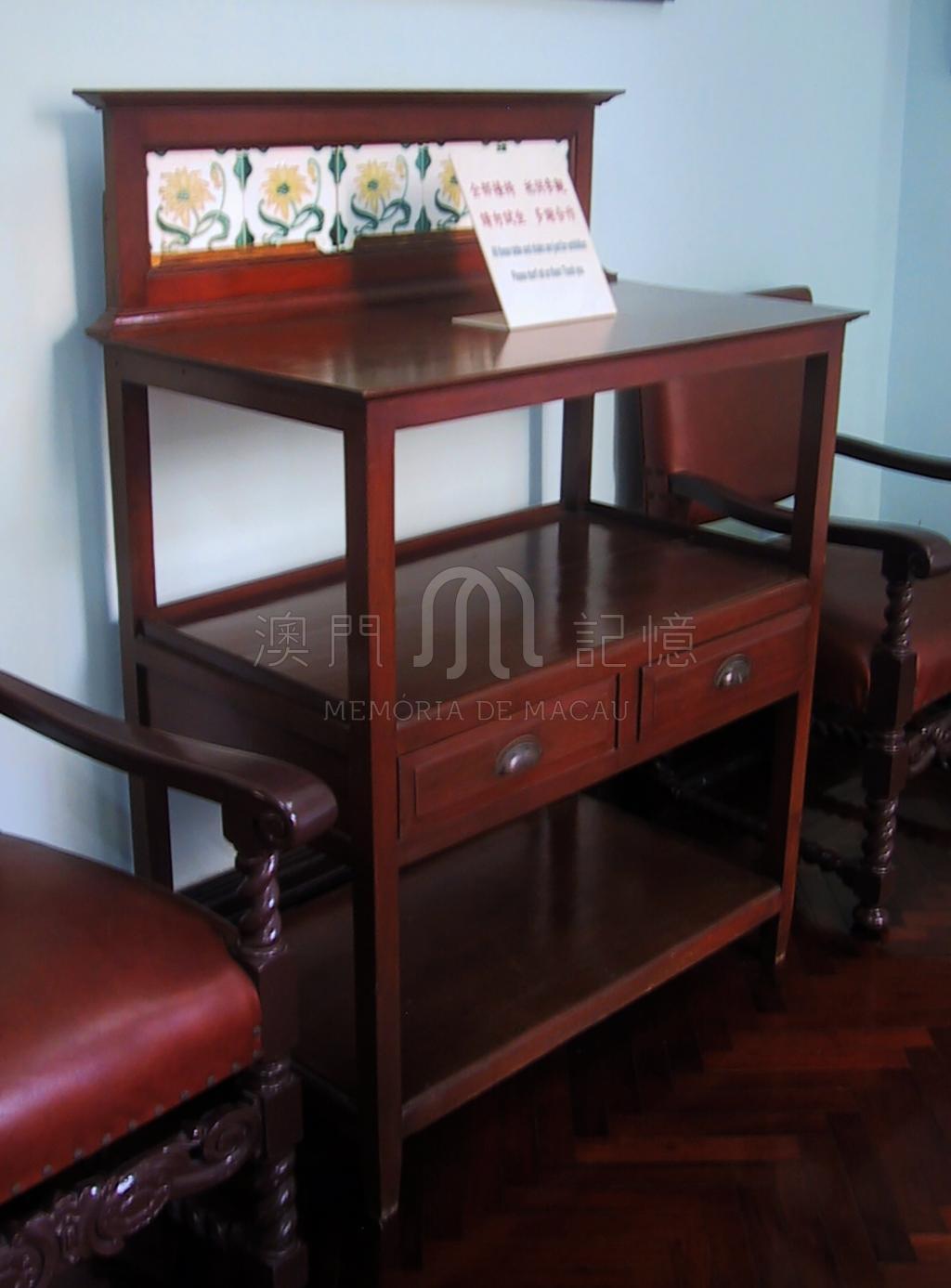 傢俱主體以紅棕色實木打造,設抽屜與開放式隔層,立面鑲嵌新藝術風格進口浮雕瓷磚,採用黃釉綠彩工藝,紋樣取南洋熱帶花卉(如朱槿、雞蛋花)搭配曲線藤蔓,借鑒歐洲新藝術運動的自然流線設計,並融入華人傳統的裝飾審美。此類瓷磚多由比利時、英國或日本進口,是娘惹族群展現身份與品味的象徵,也見證了海上絲綢之路的文化交融與貿易往來。