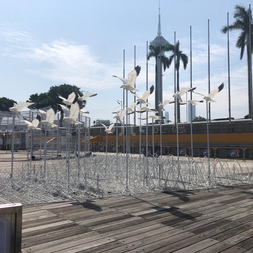 光影節的特色裝置雖然在日間沒有亮燈,但也別有一番風味,在藍天白雲的襯托下快樂的海鷗自由地飛翔。