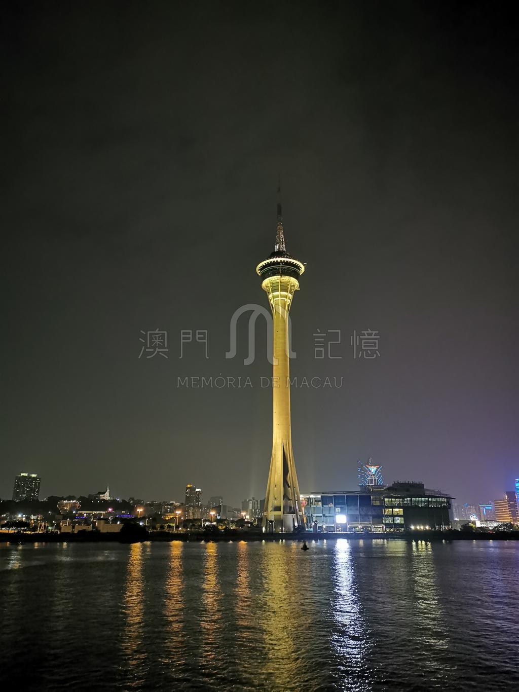 在海上遠跳澳門旅遊塔晚上的景色,見證著澳門快速的發展。