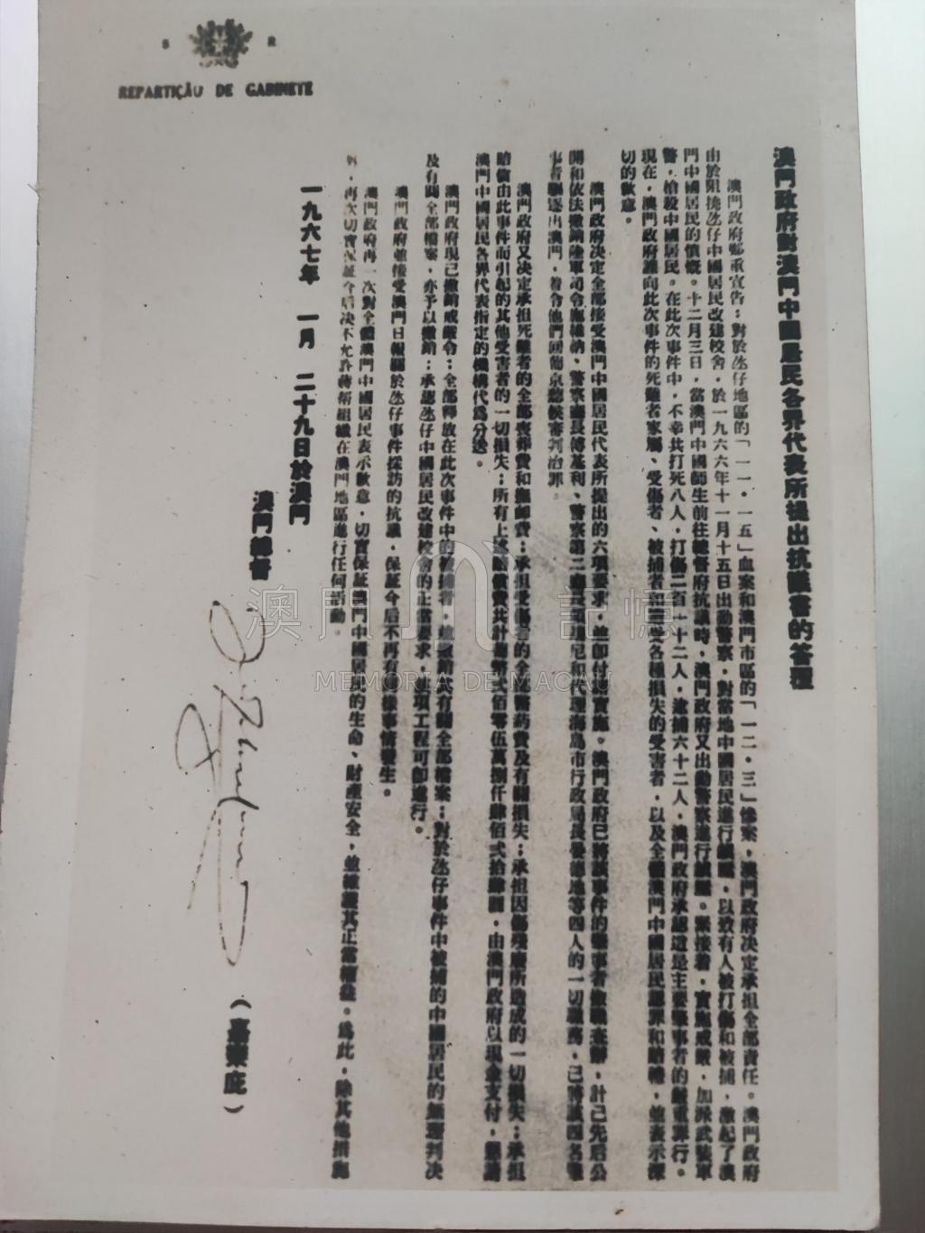 小時候,婆婆很愛跟我說故事。這件123事件也曾跟我說了多遍。這幅相片,仍存在婆婆相簿中。相中是當年嘉樂庇澳督所作的回覆,總結亦終結了這次事件。最終澳葡當局道歉並無條件接納相關氹仔居民及中學學生聯合會的條件,事件方得以平息。這件小城事件雖已落幕,但這段澳門記憶亦已記載於歷史當中,告訴我們,這事件對澳門所做成的各種改變及影響。