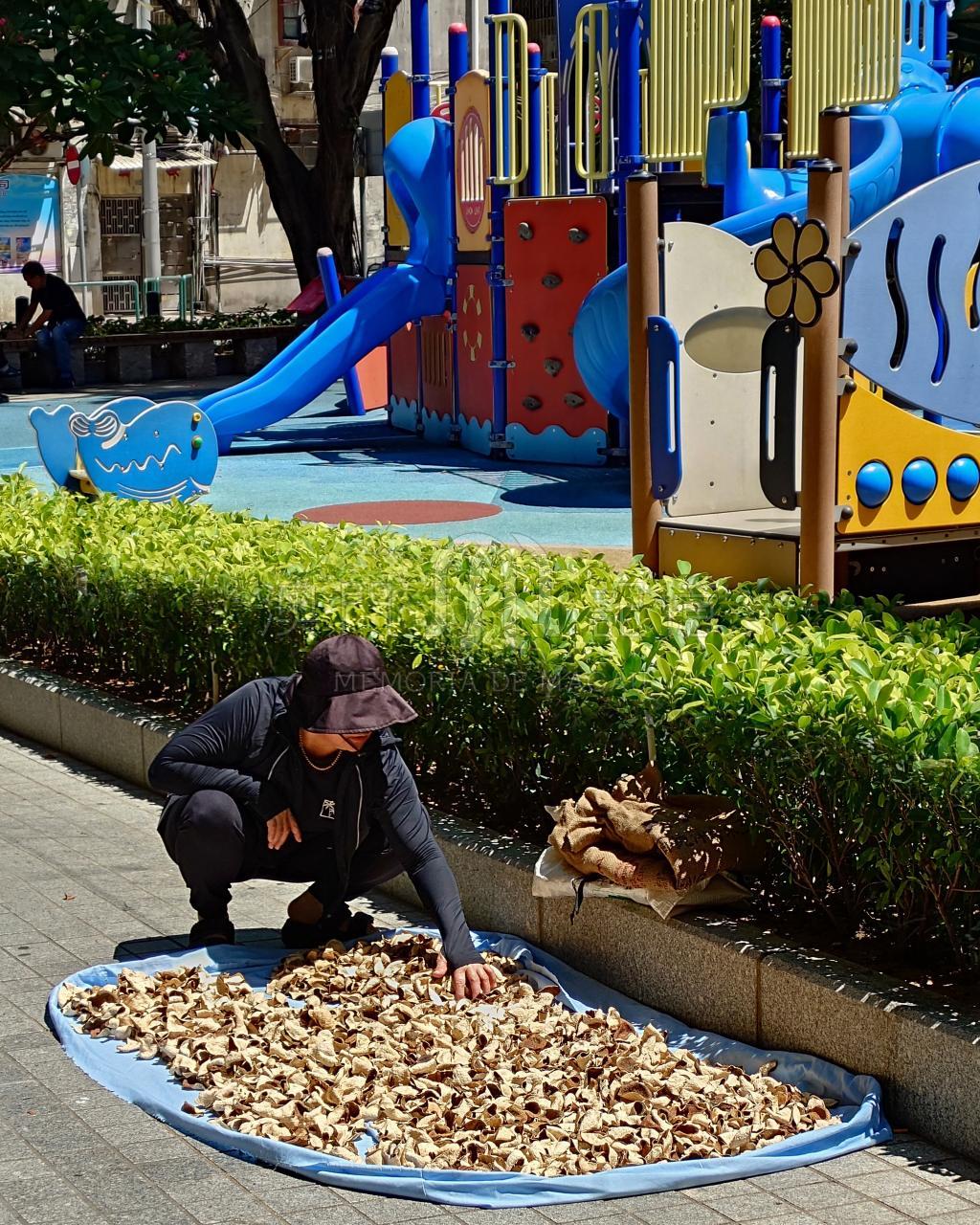 祐漢小公園旁之藥材店伙計在門前曬果皮。