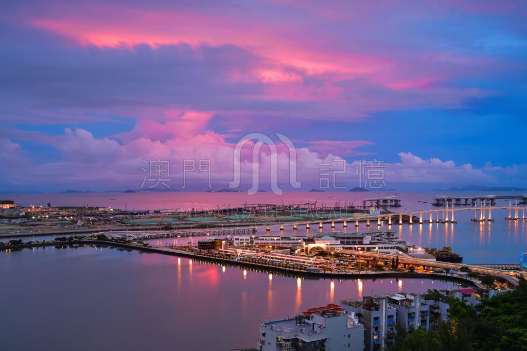 照片除記錄外港夕陽雲霞反紅時光,亦記錄了澳門大橋建造進度。