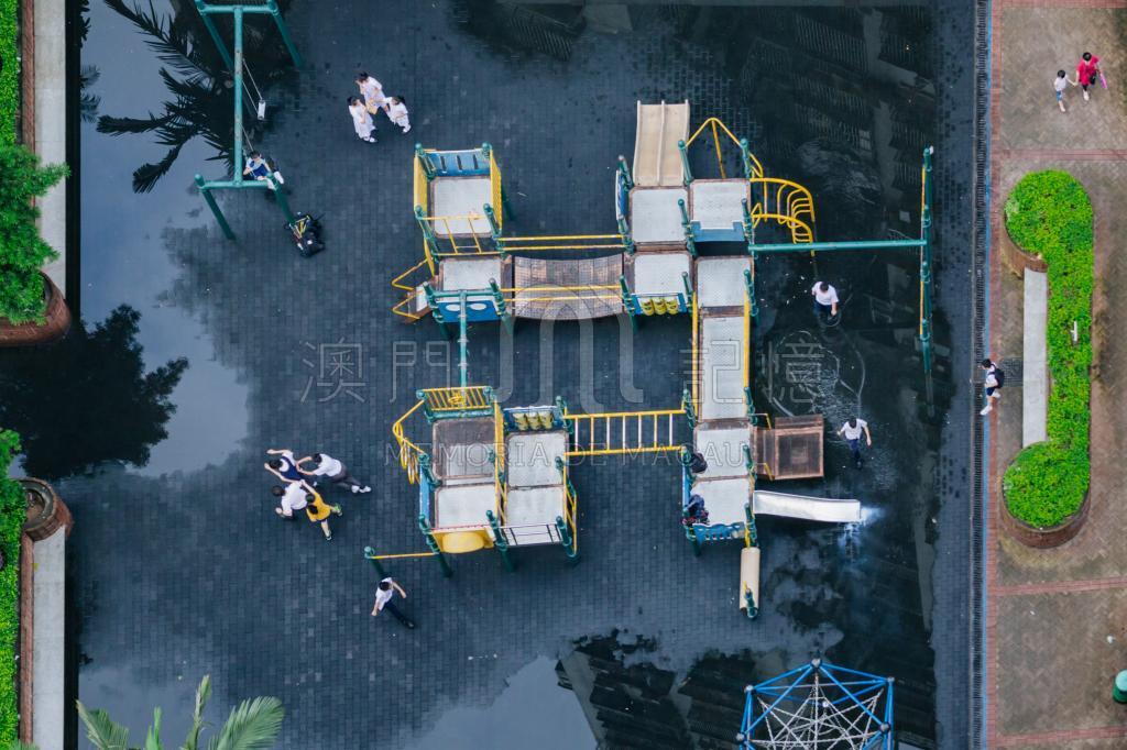 雨後的公園空氣清新,水珠掛葉。學生們追跑笑鬧,踩水、盪鞦韆,清脆歡聲滿園地。
