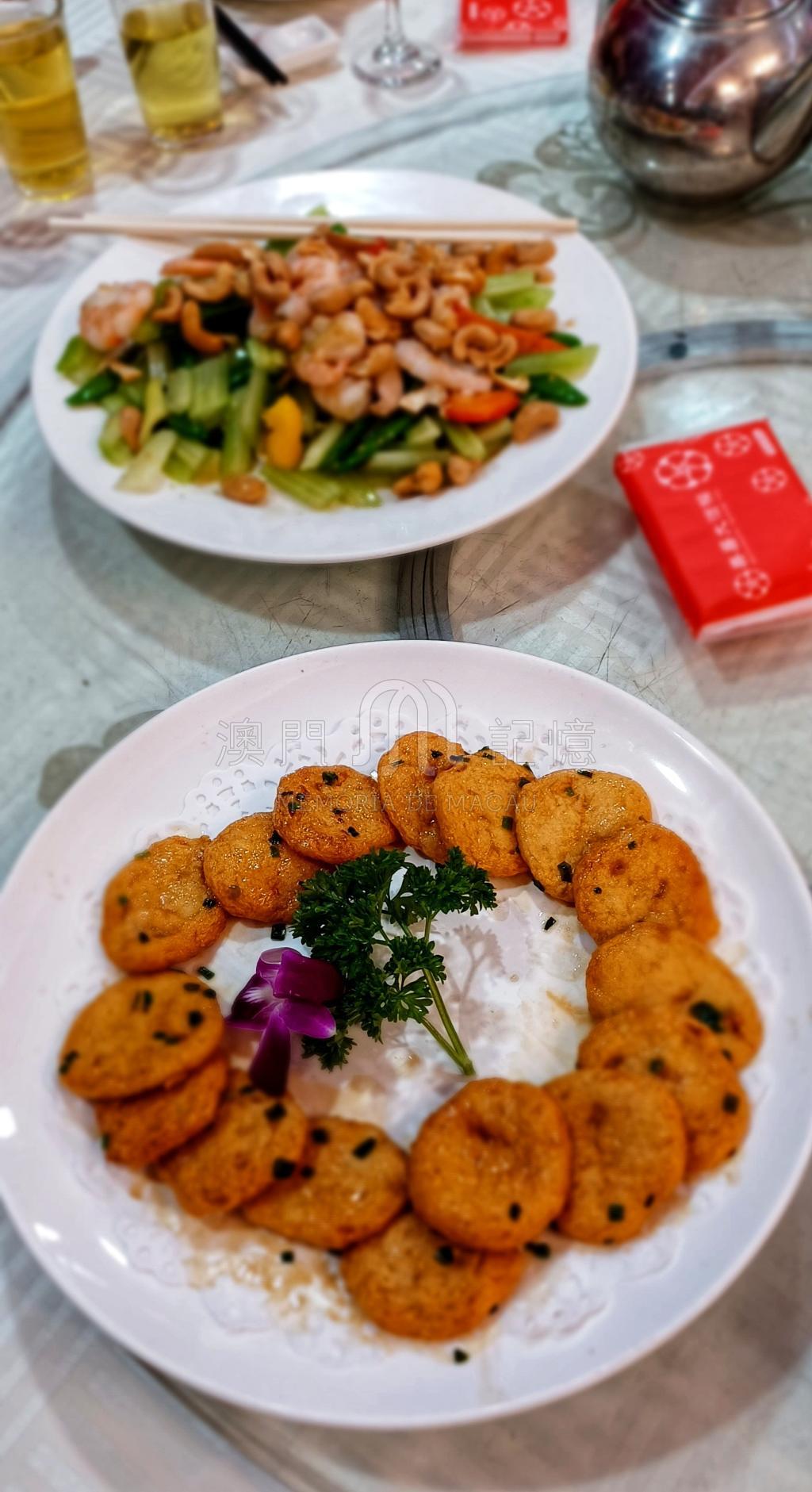 青洲美居大酒樓除了有美味的點心,還有炸墨魚餅和腰果肉丁。