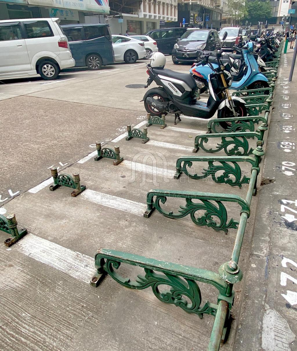 以往在南灣區會看到一些具有歐式裝飾藝術風格的電單車泊車位置分格裝置,可惜近年已拆除。