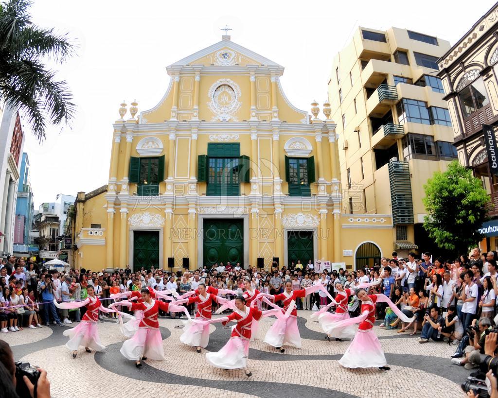 國際青年舞蹈節舉行巡遊活動,舞者在世遺景點下表演,吸引市民和旅客圍觀。