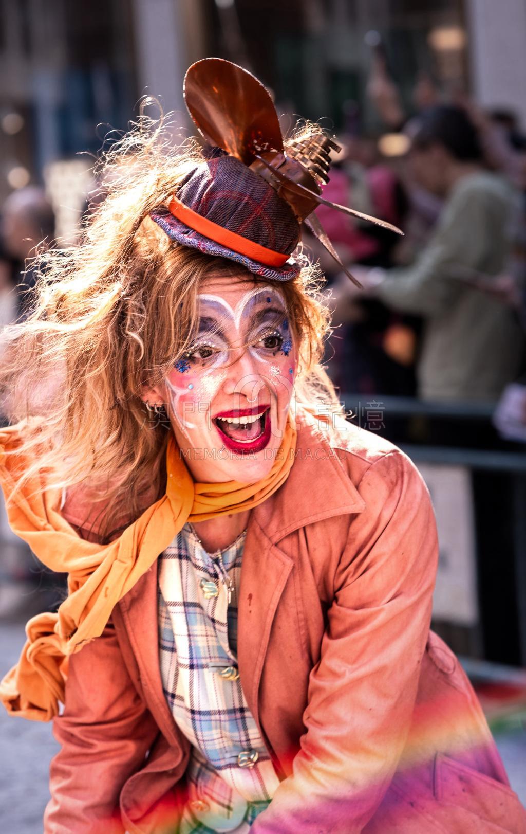 2025澳門國際幻彩大巡遊,表演者面部繪有色彩斑斕的誇張妝容,眉眼處的藍粉裝飾與亮紅唇色形成強烈視覺衝擊,嘴角大張露出燦爛笑容,滿是鮮活的感染力。彩帶無意中成為照片的前景,輕輕一揮形成了一道絢麗的彩虹。