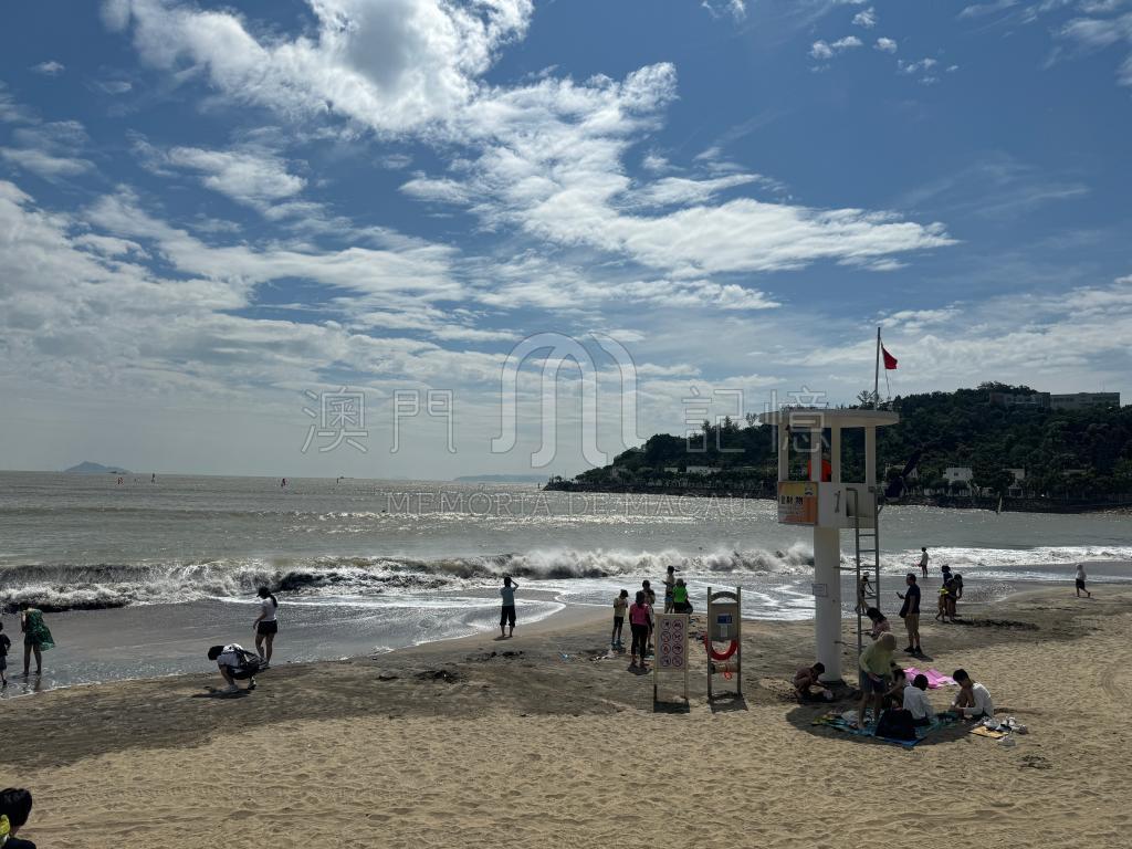 看似風和日麗的上午,其實海灘掛了紅旗,海面也很大浪,人們都在觀浪。