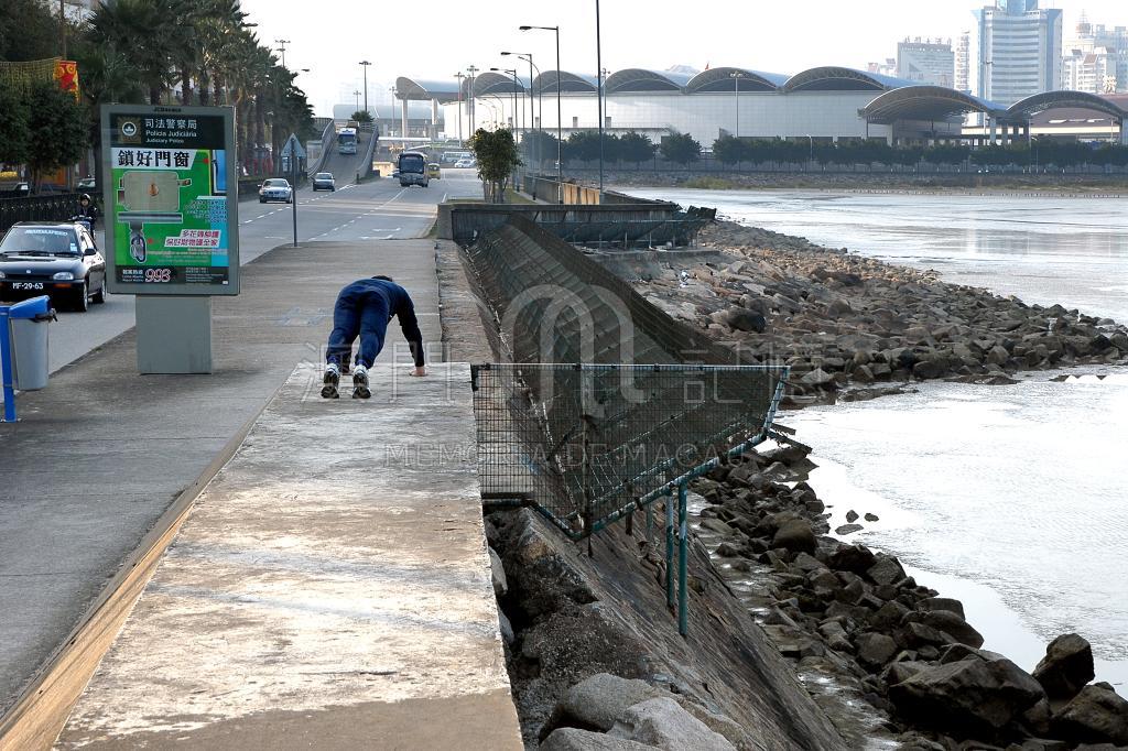 晨早上市民在關閘海邊堤岸上鍛煉身體做起掌上壓來。