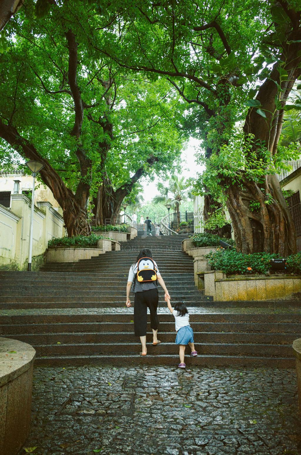 嘉模斜巷沿斜坡而上,有許多當年土生葡人聚居的兩層樓平房,建築顏色鮮明,承載著豐富的文化和情感內涵。一位婆婆陪著小孩慢慢而上,走上歷史的階梯。