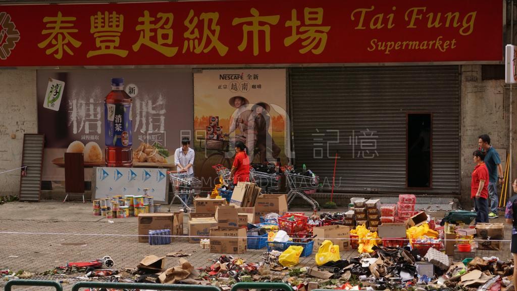 2017年“天鴿”颶風横掃澳門,水浸嚴重,筷子基其一重災區,水災過後,超市職員忙於清理受損貨物待運走。