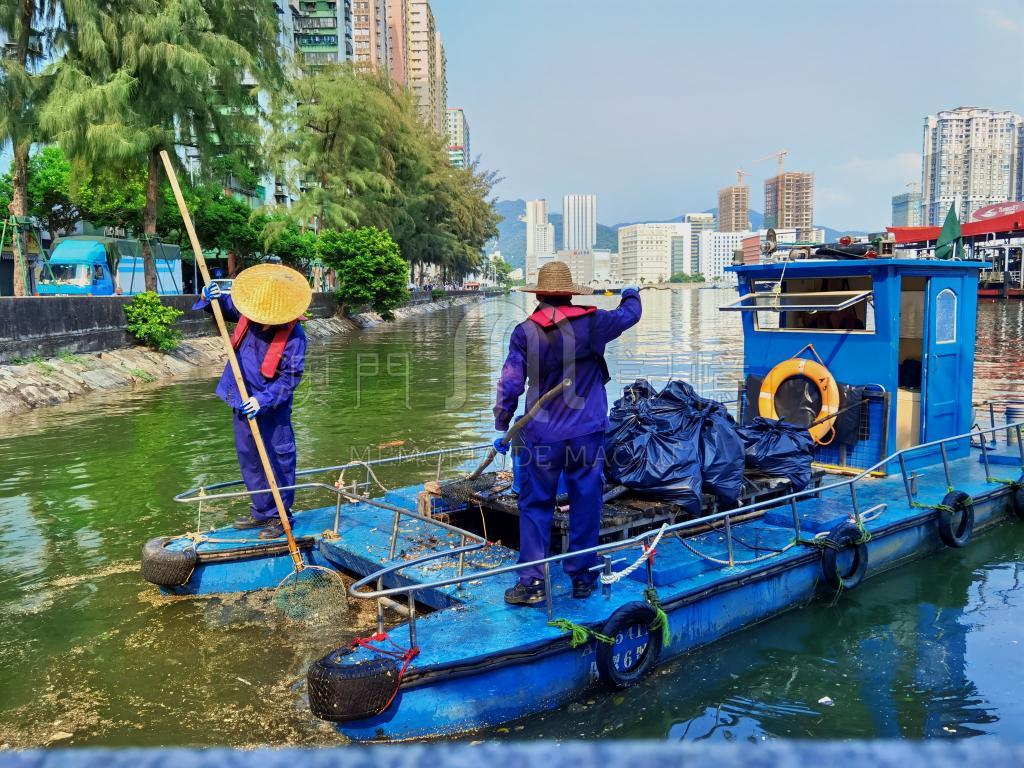 筷子基北灣海旁是周邊街坊的散步勝地。因應沿岸休憩區優化及涵箱渠建造工程,沿岸陪伴街坊多時的十多棵木麻黃及2棵陰香樹已永遠消失。圖為清潔專營公司人員在清理水上垃圾。