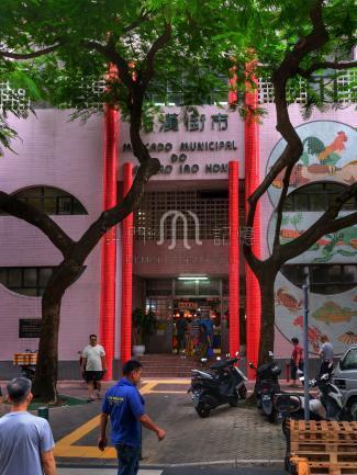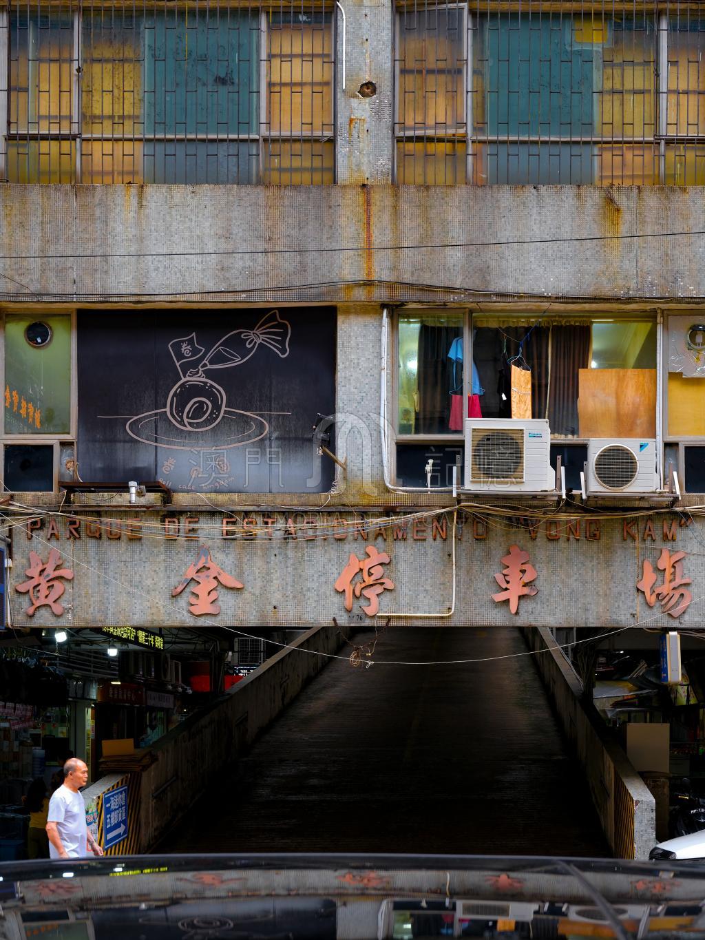 圖片呈現祐漢黃金停車場入口的混凝土建築,帶有老舊的瓷磚外牆、鐵製招牌及中葡雙語文字("Parque de Estacionamento Wong Kam")。窗戶後的日常生活場景(如晾衣)和商場氛圍,展現澳門社區的實用與人情特色。圖片還捕捉了老化痕跡與現代空調設備的對比,反映時間的流逝。