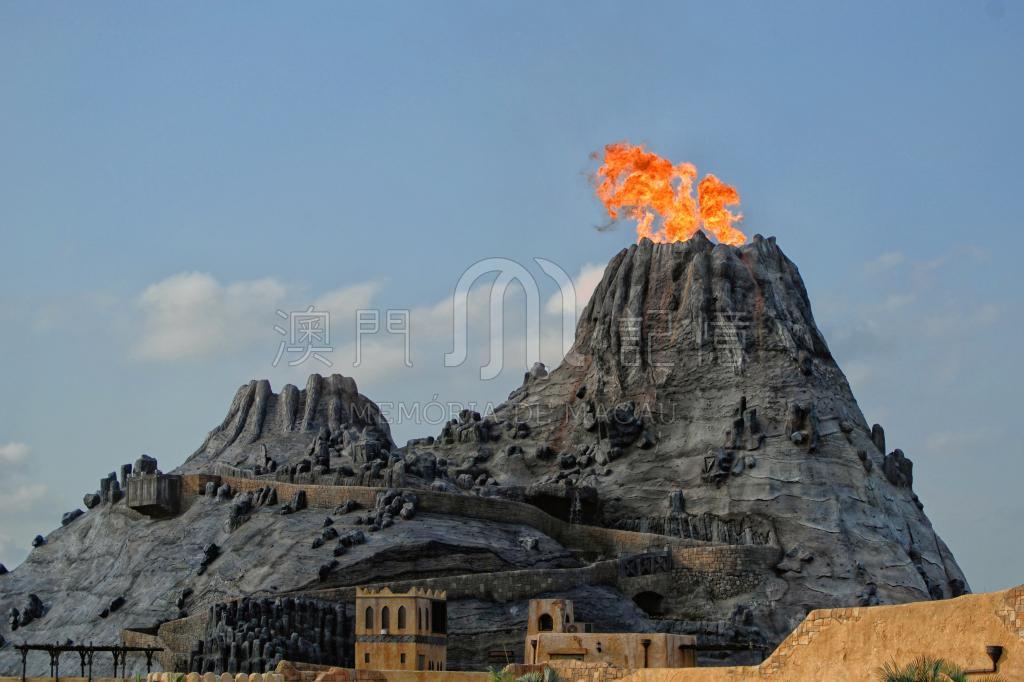 澳門漁人碼頭的「火山」是早期一個標誌性的人工建築,高約35-40米,有雙火山口,定時噴火,內部曾有室內過山車(奪寶歷奇)和觀光船(烈焰激流)等遊樂設施,可惜因意外和環境考量,現已拆除成為歷史地標。