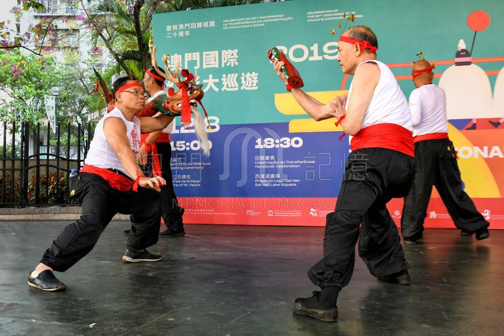 2019年澳門國際幻彩大巡遊於祐漢公園舉行延伸匯演,各巡遊隊伍登台展現風采,醉龍隊帶來的傳統技藝表演更是全場焦點。